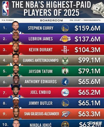 摊开这份新公布的福布斯2025年NBA球员排行榜单,前十人分别是库里、詹姆斯、杜兰特、字母哥、塔图姆、爱德华兹、恩比德、巴特勒、亚历山大、约基奇;从这份名单来看,这几乎就是目前NBA时代的顶流版图了。只是最被关注的,还是榜首位置终于换人了。