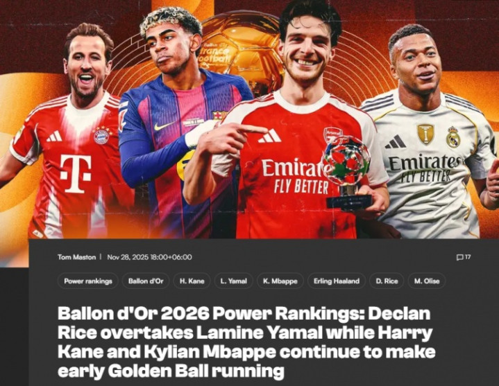 直播吧11月28日讯本赛季欧洲五大联赛基本已进行了三分之一的赛程,欧冠、欧联联赛阶段赛程也已过半。“进球网”评出了目前为止2026金球奖竞争力前10名的球员。