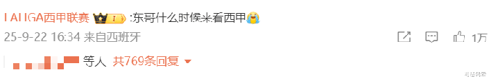 没想到西甲联赛也留言了。“东哥,什么时候来看西甲?”他们还发了一个哭脸的表情,似乎有点伤感。樊振东看了德甲联赛,又看了英超联赛。西甲联赛有了失宠的感觉。