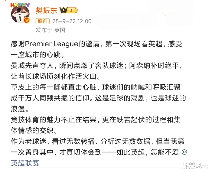 樊振东看了阿森纳与曼城的比赛后,感触良多。樊振东感慨道:“作为老球迷,看过无数转播、分析过无数数据,但当我第一次置身其中,才真切体会到——如此英超,怎能不爱。”