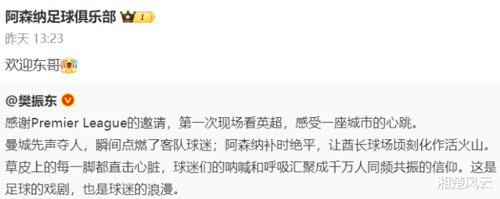 近日,奥运冠军樊振东在社媒发文,感谢了英超联赛。他受英超联赛的邀请,在酋长球场看了一场阿森纳与曼城的比赛。