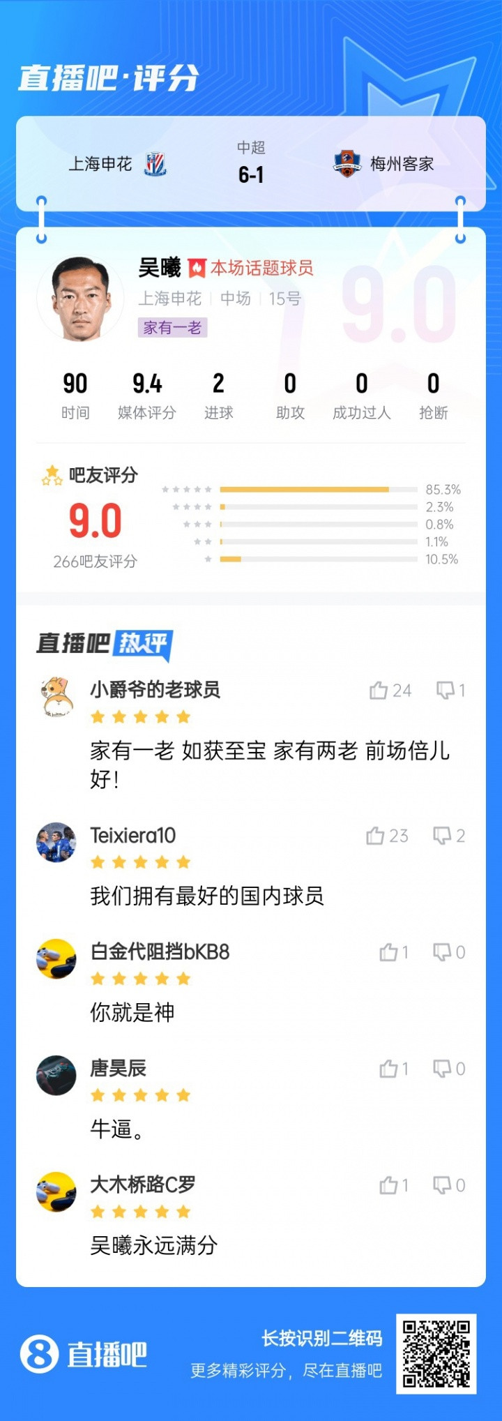再次感谢上海申花足球俱乐部、吴曦对直播吧中超每轮最佳球员评选活动的大力支持!