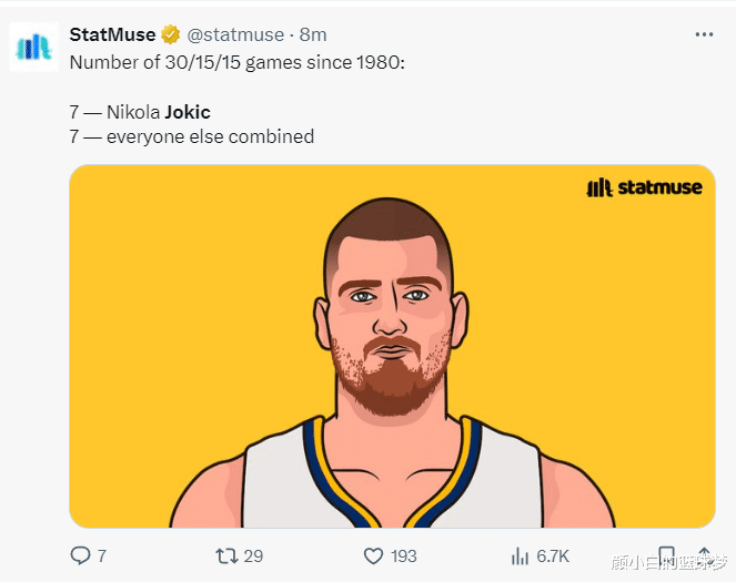 5.自1980年以来约基奇30+15+15场次7次,其余球员合计7次;