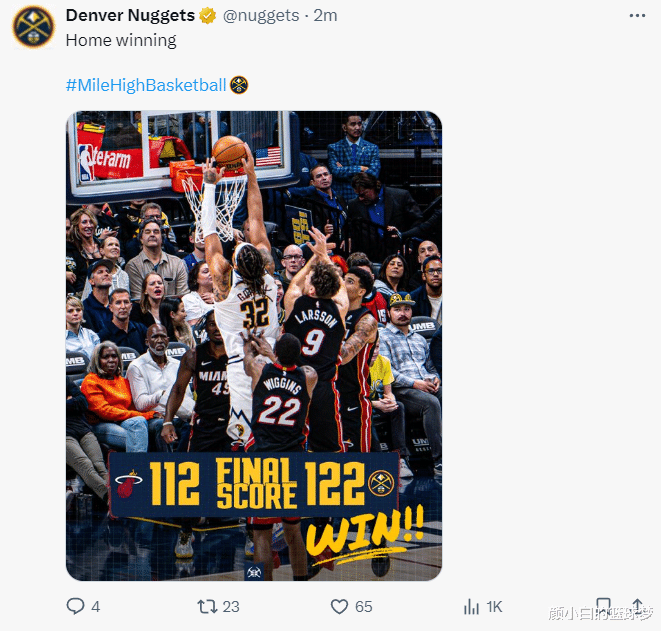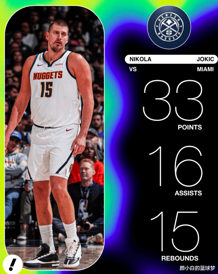 丹佛掘金122-112大胜迈阿密热火拿到二连胜。这场比赛尼古拉-约基奇三节就拿到三双,末节送出关键助攻浇灭热火的反扑气焰,感觉约基奇拿到30+三双只是微微出汗,约基奇已经是联盟全新的三双魔兽。