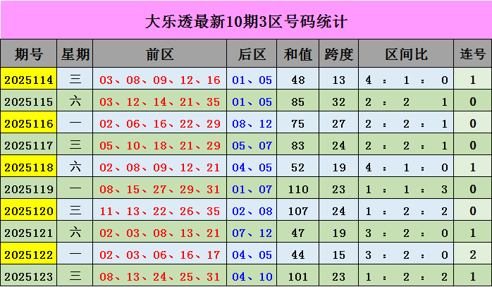 后区开出号码04、10落在1、3区。最近50期,一区(1-4)开出号码37个,二区(5-8)开出号码33个,三区(9-12)开出号码30个,1、2区号码较热,3区较温,本期推荐关注:02、09