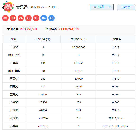 大乐透第25123期开奖。当期开奖号码为:前区08 13 24 25 31,后区04 101。当期前区号码大小比为3:2,奇偶比为3:2,三区比1:2:2;前区开出1组连号24 25;后区开出小大组合04 10。