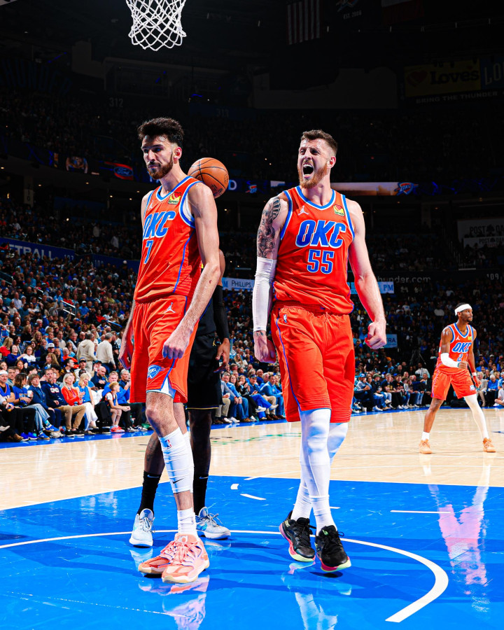 虎扑11月13日讯雷霆官方更新X,晒出一张雷霆球员切特-霍姆格伦,以赛亚-哈尔滕施泰因和谢伊-吉尔杰斯-亚历山大的赛场照与球迷分享。